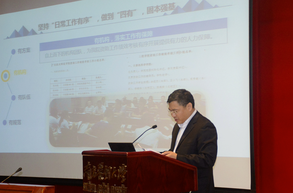 幸小涛介绍了我院学生资助育人工作的工作思路及具体做法:坚持“日常工作有序”,做到“四有”,固本强基;坚持“重点工作有效”,做到“四聚焦”,凝焦聚力;坚持“特色工作有名”,做到“五创新”,开拓进取。通过建立健全资助育人工作体系,创新资助育人工作模式,塑造资助育人工作品牌,逐步实现从 “基本保障型的经济资助”到“发展型资助”“精准资助”的转变,实现学生资助育人工作的“育德育心,强能树人”的功能。(学生处)
