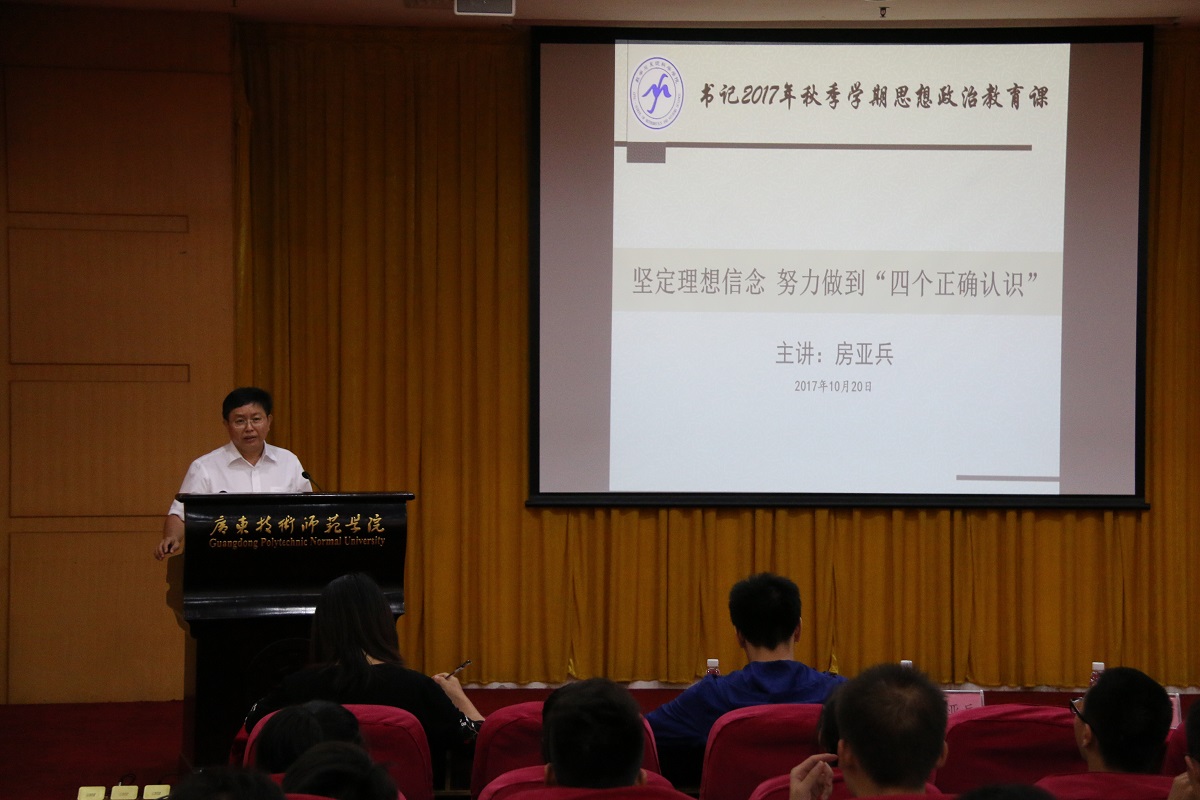 2017年10月20日在校本部第一教学楼208室,学院党总支房亚兵书记给学生干部和学生代表,作了题为《坚定理想信念,努力做到“四个正确认识”》的2017年书记秋季学期思想政治教育课。他以典型的历史资料为例,首先对理想信念的深刻内涵进行了深入讲解,认为当代大学生应把实现社会主义核心价值观培养成自己的理想信念。同时,结合学习党的十九大和全国高校思想政治工作会议精神,对大学生如何做到正确认识世界和中国发展大势、如何做到正确认识中国特色和国际比较、如何做到正确认识时代责任和历史使命、如何做到正确认识远大抱负和脚踏实地等问题进行了深入阐述。(多多28)