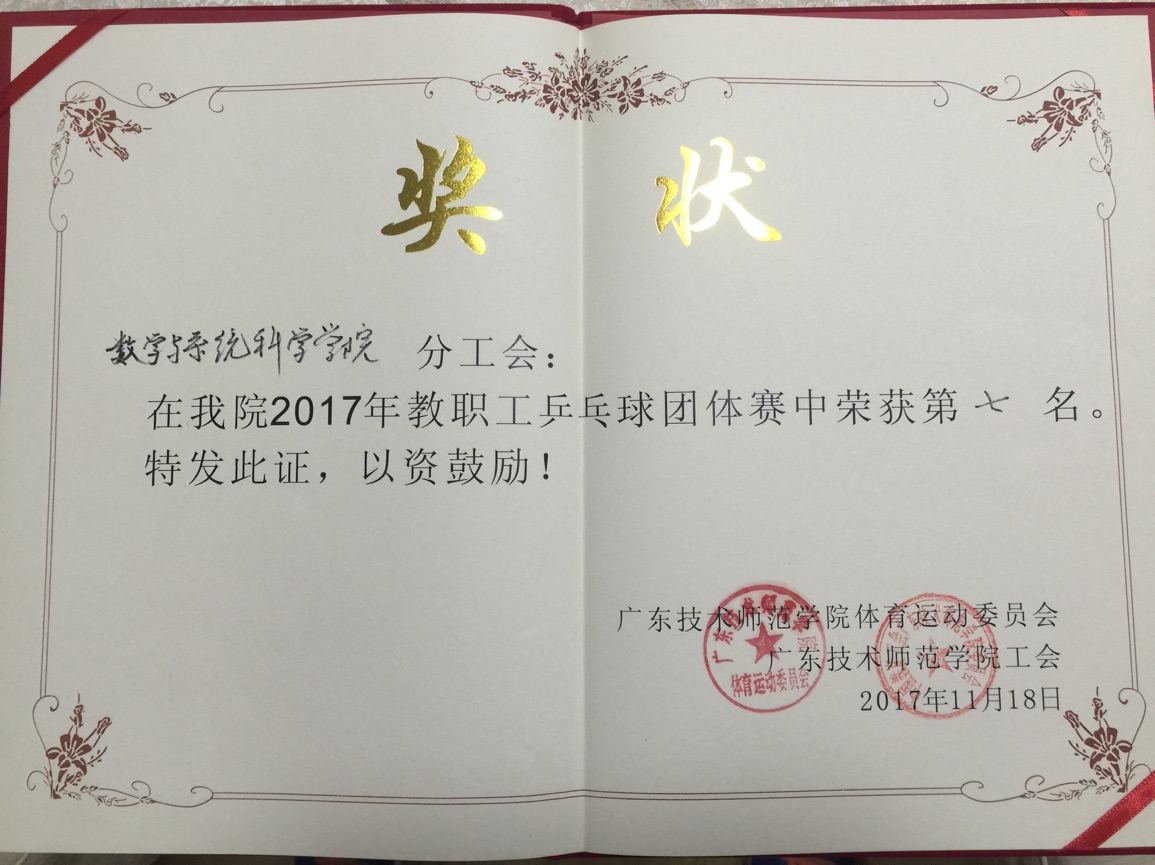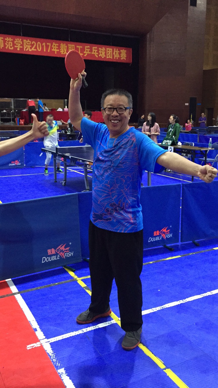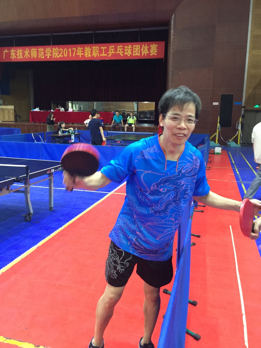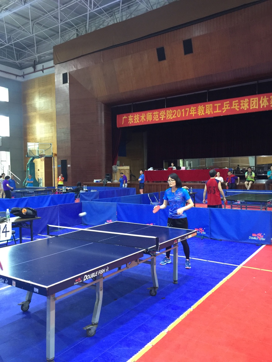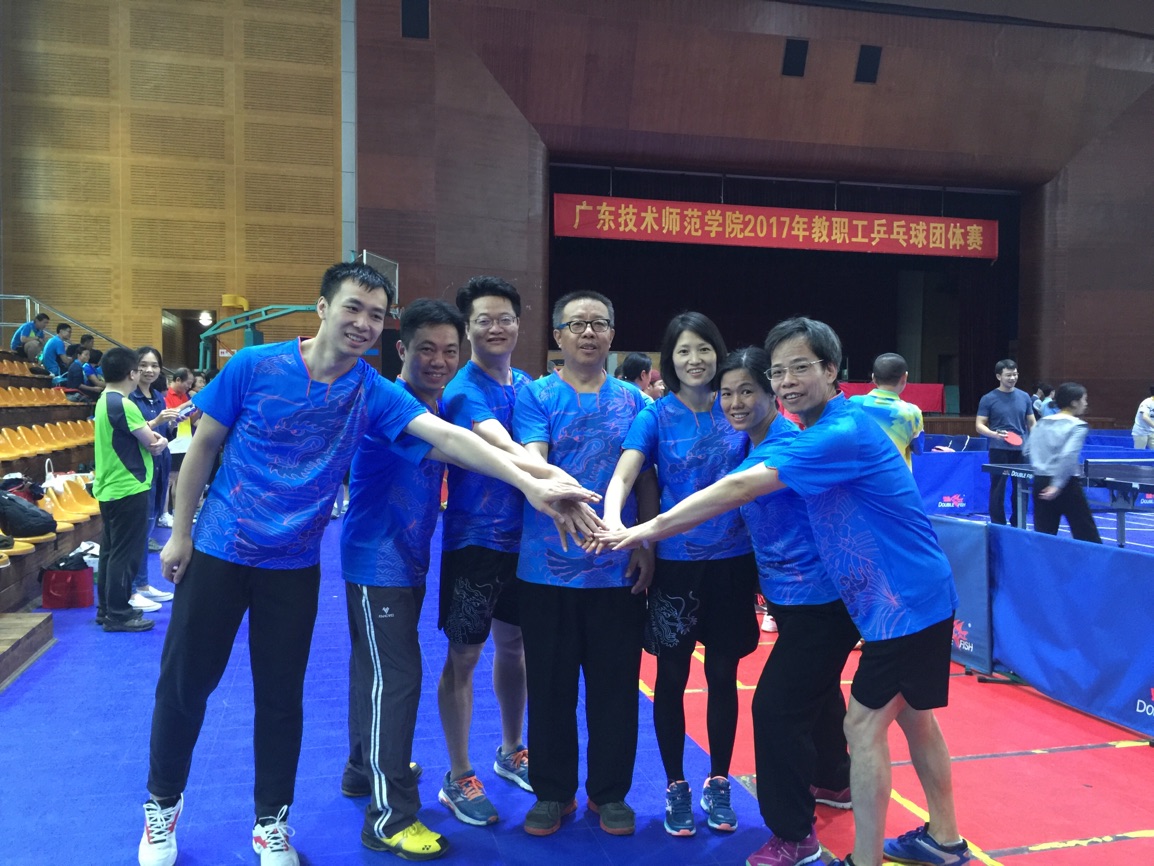 2017年11月18号, 广东技术师范学院2017年教职工乒乓球团体赛在校部综合馆三楼举行。我院派出肖黎明教授为教练、关裕中老师、唐四云博士、翁伟明博士、刘燕玲老师、陈远明老师,游志福副院长为领队的强力阵容。