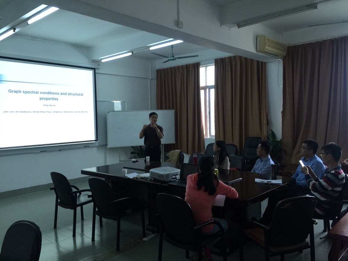 2017年11月30日下午,美国西弗吉尼亚大学赖虹建教授应邀到我院作学术报告。学术报告在校本部第一教学楼1211室举行,报告题目是《图的特征根与网络的一些结构的关系》。学院领导梁海华、游志福,组合图论方向及对此课题方向感兴趣的老师、研究生参加了报告会。我院会议室也是教师学术报告会的场所,反映了学院的科研学术氛围逐渐浓厚。