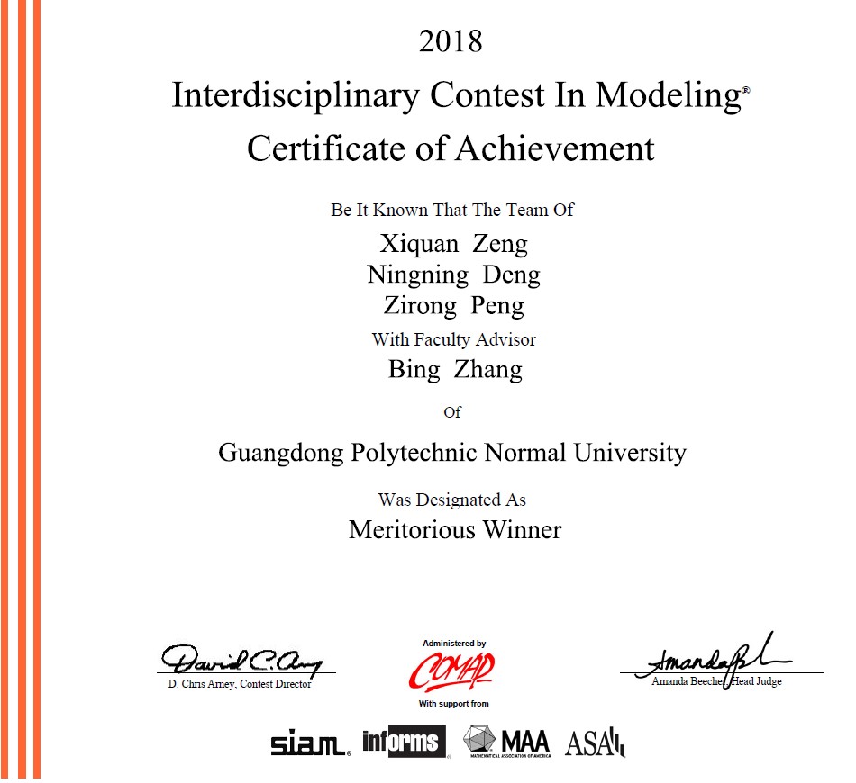 近日,2018年美国大学生数学建模竞赛与交叉学科数学建模竞赛(MCM&ICM)成绩揭晓。我校学子夺得国际一等奖(Meritorious Winner)2,国际二等奖(Honorable Winner)7项,创下参加该竞赛以来的最佳成绩。