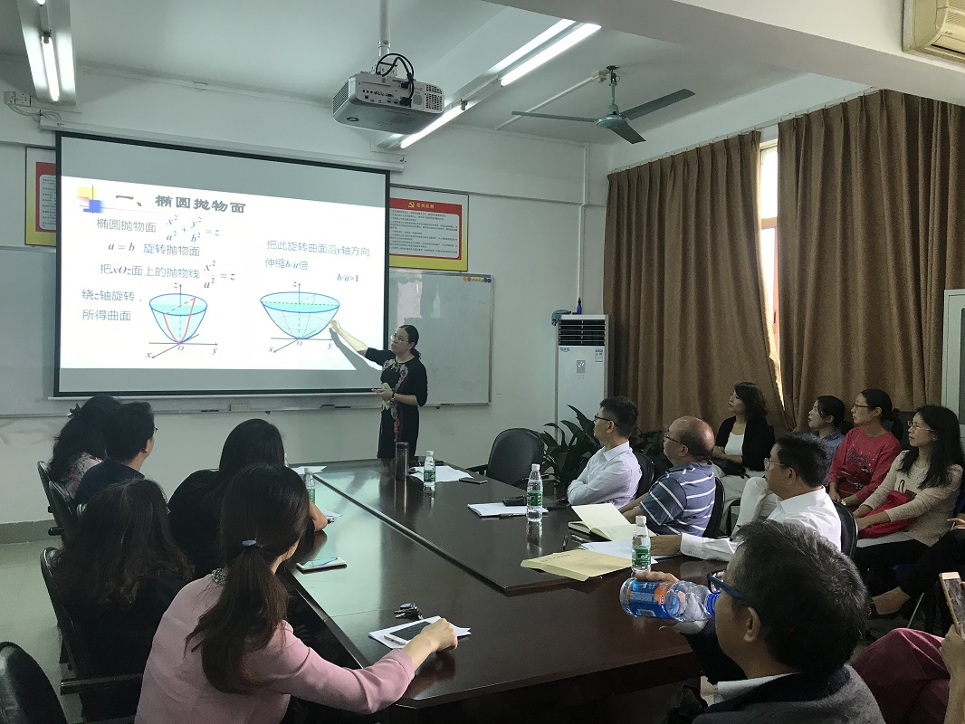 本次活动安排了张姣玲老师讲授《椭圆抛物面和双曲抛物面》。该作品曾在今年8月获得由教育部高等学校大学数学课程教学指导委员会和全国高等学校教学研究中心举办的第四届全国高校数学微课程教设计竞赛全国一等奖。 张姣玲老师分享了她在设计《椭圆抛物面》的心得体会,全院教师就教学设计和讲课过程的问题和张老师进行了热烈的讨论。