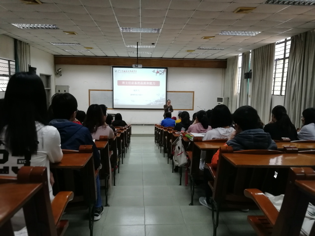 为保证数学与应用数学师范专业的《数学师资孵化课程》高质量开展,我院邀请了广州市海珠区黄埔中学魏凯飞校长以及天河区天府路小学黄爱妹老师到我校为16级数学与应用数学师范专业学生做专题授课。该授课分两次进行。3月5日,黄爱妹老师作了“新教师如何上好一节数学课”的专题讲座,她结合自已的小学教学经历及在教学过程的具体教学案例来和同学们分享讲好一堂小学数学课的若干“小窍门”。 3月12日下午,魏凯飞校长作了“班主任必备的品质与能力”的专题讲座,他结合自已的教学管理经验,以如何为人,如何为师,到如何为班主任为主线,生动幽默地向同学们讲述了开展班级管理工作,当一名优秀的班主任的方法。两位老师的讲座均受到了同学们的喜爱。