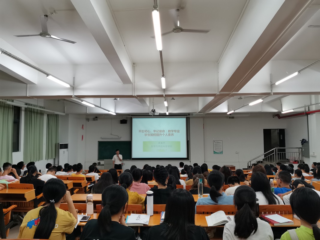 11月6日晚上,我院梁海华院长在白云校区第三教学楼107室为2019级数学与应用数学(师范)和信息与计算科学两个专业的学生上了一堂题为《不忘初心、牢记使命:数学专业学生如何提升个人素养》的思想政治理论课。