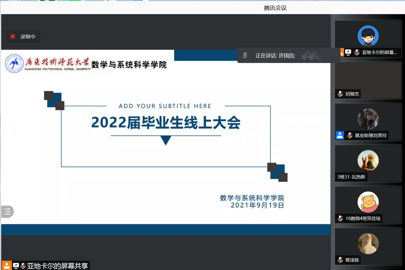 为确保我院2022届毕业生各项毕业工作的正常进行,2021919日晚,我院召开2022届毕业生线上动员大会。学院院长梁海华、党委副书记许国良、副院长陈月红、辅导员黄惠婷、辅导员亚地卡尔出席此次会议。本次会议由亚地卡尔老师主持。