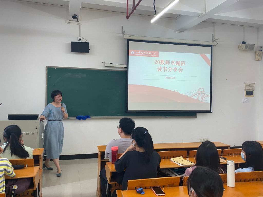 5月5日下午,学院数师卓越班在白云校区第二教学楼301举办首届2020级数学与应用数学师范(卓越)班读书分享会。学院党委书记白雪飞、副院长陈月红、博士辅导员张洪杨老师、20级数师卓越班全体同学参加了读书分享会。