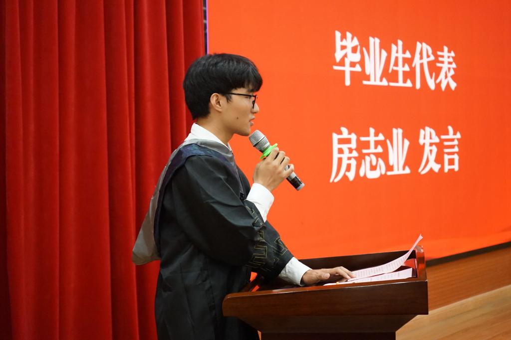 毕业典礼上,肖黎明教授,2018级信息与计算科学专业房志业同学分别代表教师和全体毕业生发言。肖黎明教授希望各位毕业生记住“厚德博学,唯实求新”的校训,争做一个有新道德、新思想、新知识的青年人才。房志业代表全体毕业生向学院领导和老师们致以最衷心的感谢,并祝愿2022届毕业生们砥砺奋进、前程似锦,用无悔青春书写新的辉煌。