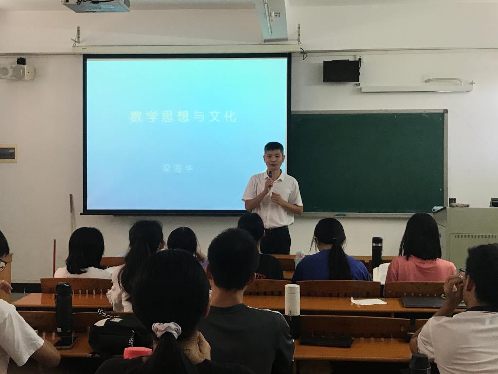 梁海华院长以代数学和分析学为侧重点,介绍了数学发展的简史,讲述了数学史上的一些重大事件,介绍了一些著名数学家的贡献及其生平的事迹。他还专门讲了中国历史上一些伟大的数学家的事迹。梁海华在讲述这些内容的同时,强调了数学思想与文化的形成过程,剖析了某些数学思想的内涵。最后,他希望同学们要学习数学家们追求真理、勇于探索、敢于创新的精神,要树立坚定理想信念,以坚韧不拔的精神刻苦学习,在祖国实现伟大中国梦的征程中贡献自己的力量。