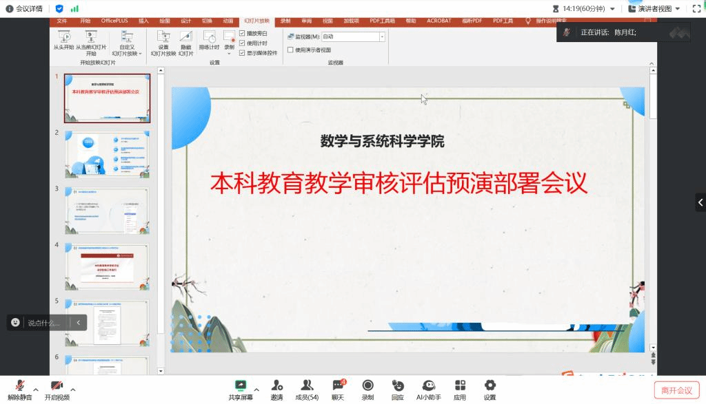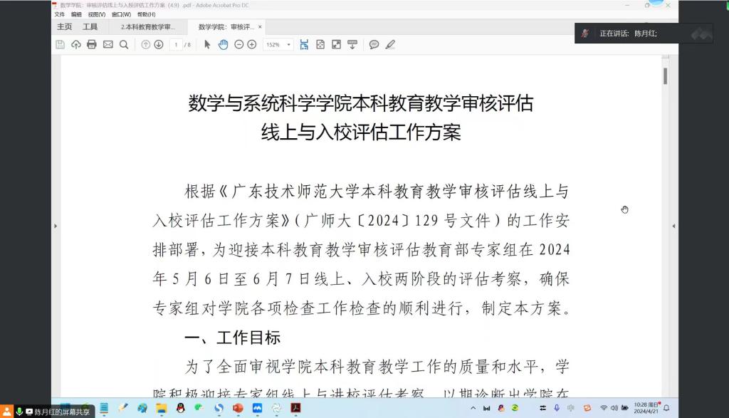 根据教育部有关本科高校教育教学审核评估工作的安排,我校将于5月6日至6月7日接受本科教育教学审核评估专家组线上与入校评估考察,为确保专家组线上评估考察期间各项工作的顺利开展,学校组成专家组对线上评估专家组的材料调阅、听课看课、访谈座谈等主要工作环节进行预演。为配合学校做好预演工作,并以此次预演为契机,调动全体教职员工积极性,认真做好此次本科教育教学审核评估工作,2024年4月21日上午,多多28召开线上会议,对评估预演工作进行部署。学院全体教职工参加本次会议,会议由学院教学副院长陈月红主持。