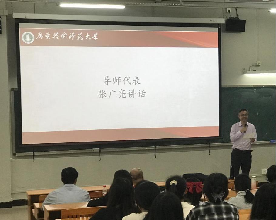 张广亮作为导师代表发言。他说明了学院推行导师制的初衷是希望在同学们成长的关键点上,能够得到具有丰富学习经历、生活阅历和育人热情的导师的指导和帮助。随后,他向同学们提出了几点建议和期望:要主动和导师联系,要带着问题找老师,要在跟随导师增进学业的同时,还要学会做人,带着感恩的心和导师沟通。