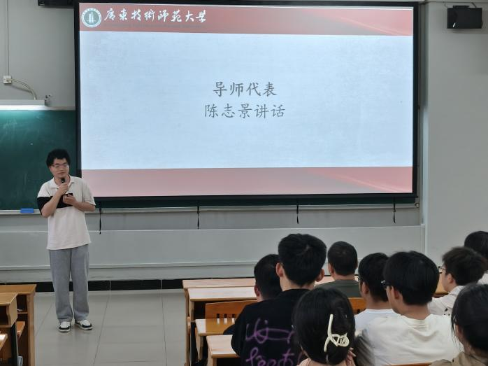 导师代表陈志景副院长结合自身求学经历,分享了对卓越教师内涵的理解。他回顾了三位恩师对其学术态度、跨学科视野及师德修养的深远影响,并寄语学生:卓越不仅是学术精进,更需涵育教育情怀。他期待学生在未来三年中深耕专业、勇于创新,同时以谦逊之心向师长、同学习,实现全面发展。