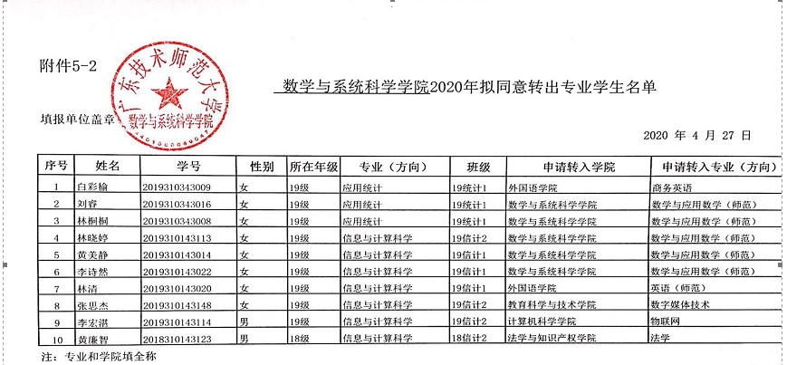 根据《广东技术师范学院普通本科生转专业实施办法》(广师大〔2019〕583号)等文件精神,以及《关于做好2020年度转专业工作的通知》《关于公布各学院接收转专业计划暨学生转专业报名申请的通知》等相关工作安排,经学生个人申请,学院审核等程序,拟准予白彩榆等10名学生办理转出专业的相关手续,现予以公示。公示时间:2020年4月30日至2020年5月10日。在此期间若有异议,请将意见发至邮箱297126778@qq.com