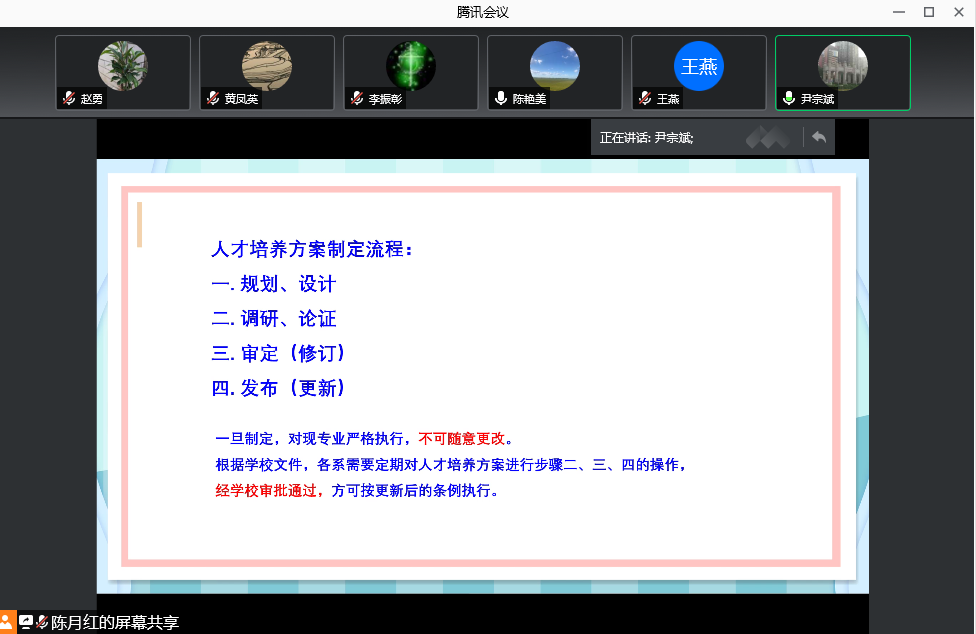 首先各系主任和专业负责人汇报了各专业不同年级的人才培养方案执行情况,重点找出可优化、改进之处,论证改进方案的可行性。三个系就不同专业的人才培养方案的执行情况互相交流、互相取经,从而对本专业的培养模式、学分、学时、学期都有较好的借鉴和启发作用。随后,陈月红副院长说明了人才培养方案的制定流程,强调了人才培养方案制定的严肃性,指出对方案内容细节进行调整的流程需要符合要求,并要严格论证,论证后必须严格执行,不能随意调整和更改。