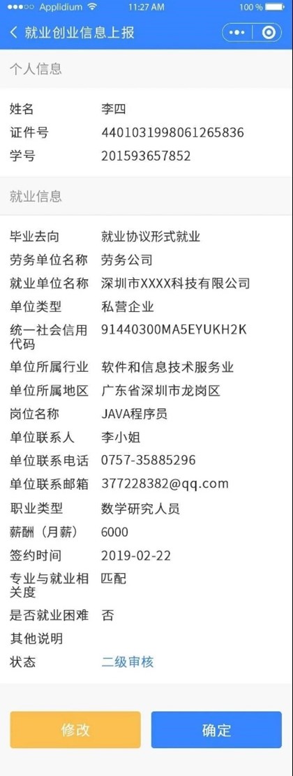 *注:进入校级(一级)审核和省级(中心)审核状态的就业信息暂无法修改,待学校、省中心全部审核完成后,方可重新修改上报信息。