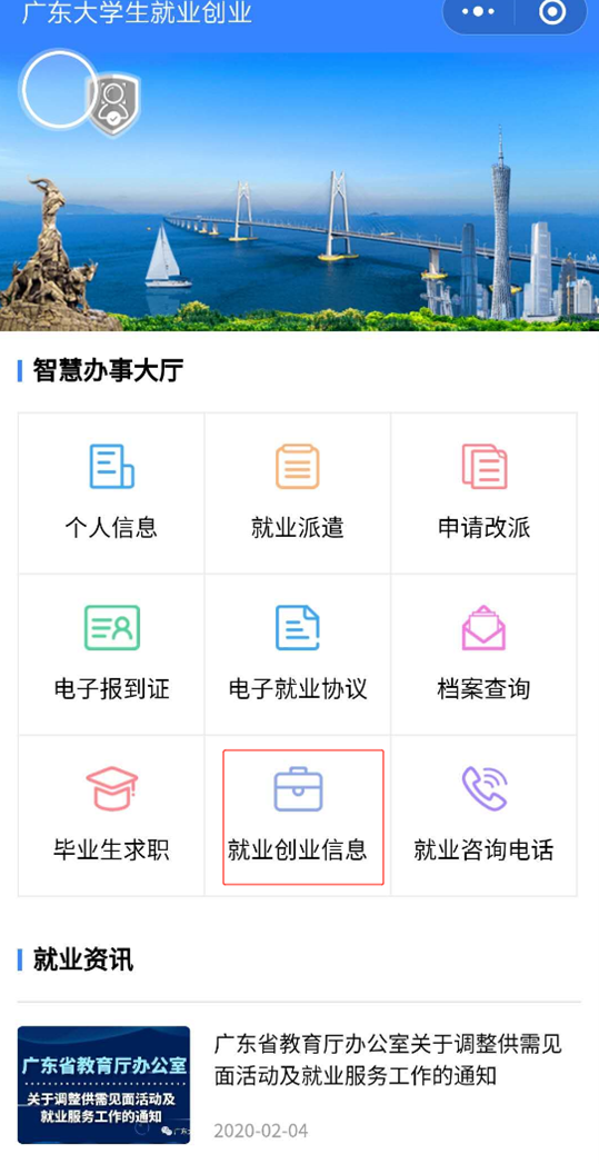 登录“广东大学生就业创业”小程序,点击进入“就业创业息”窗口,开始上报。