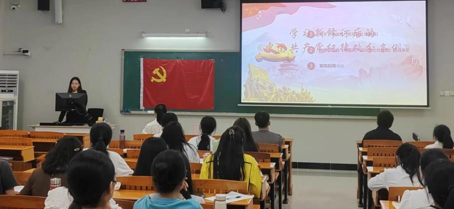 会上,全体党员共同学习新修订后的《中国共产党纪律处分条例》。学生党员何雅雯作为党员代表进行领学并作心得分享。
