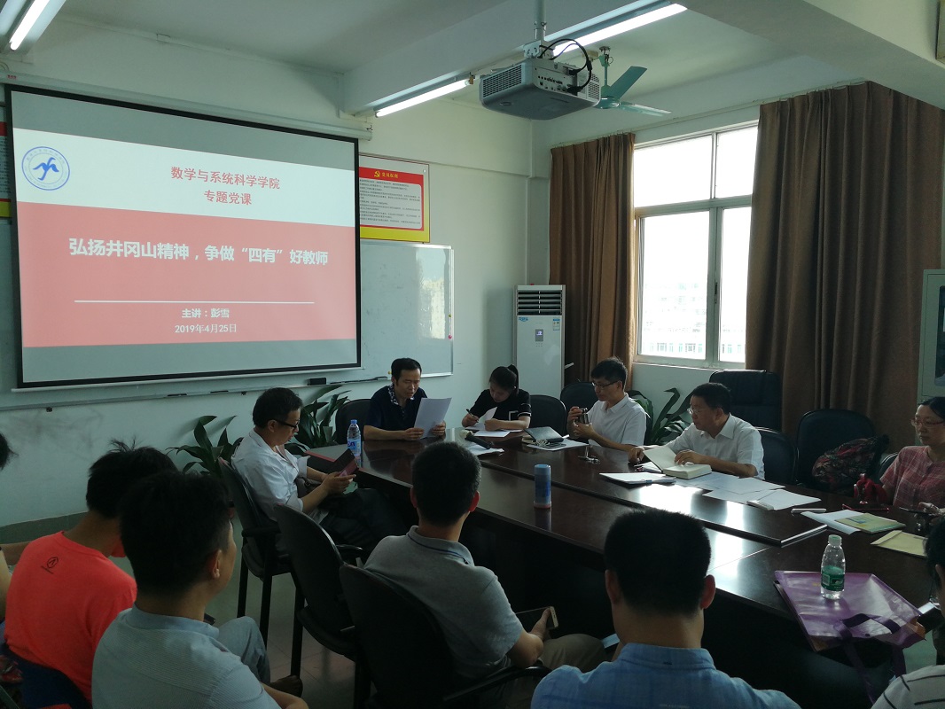 2019年4月25日下午,在校本部一教1211室,多多28教工第二党支部召开全体党员会议。会议内容:彭雪书记以《弘扬井冈山精神,争做“四有”好老师》为题,给党员上专题党课。