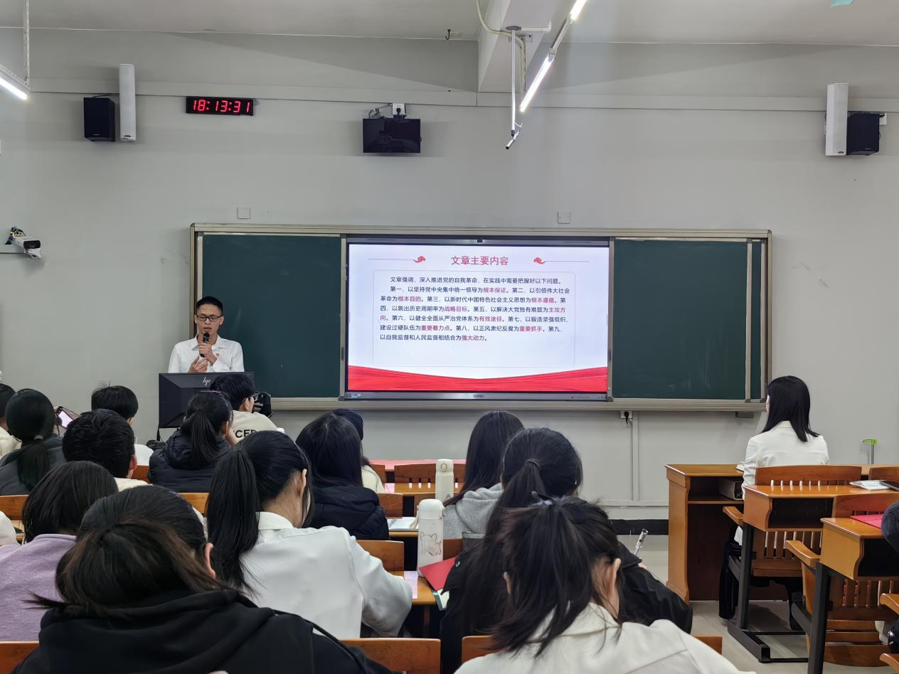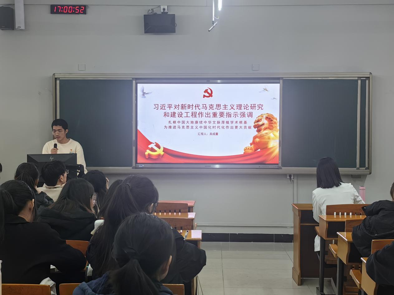 会上,全体党员共同学习习近平对新时代马克思主义理论研究和建设工程作出重要指示强调——扎根中国大地赓续中华文脉厚植学术根基,为推进马克思主义中国化时代化作出更大贡献。学生党员吴成董作为党员代表分享学习心得。