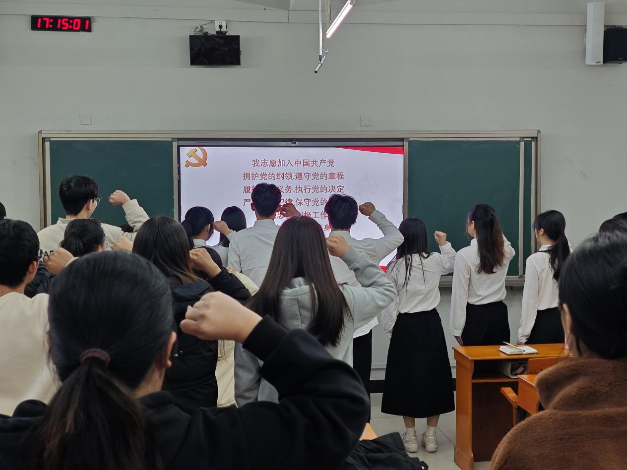 接着进行新党员入党宣誓暨“政治生日”活动。全体党员重温入党誓词,由本科生党支部书记王婷婷领誓。