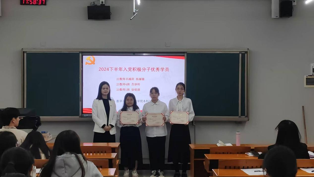 由本科生党支部书记王婷婷为杨丽敏、苏妙铃、徐铭朗颁发入党积极分子培训优秀学员证书