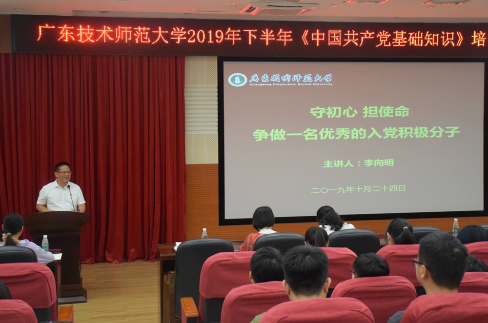 2019年10月24日下午,在白云校区三教104,学校党委副书记李向明为我院入党积极分子作了题为“守初心,担使命,争做一名优秀的积极分子”的专题党课。学生党支部书记王婷婷到现场聆听了课程。