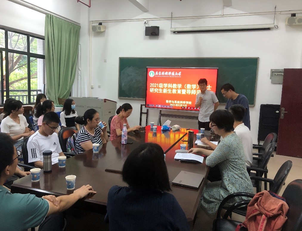 会议由陈志景副院长主持。会议的第一阶段是新生入学教育。首先,白雪飞书记代表学院全体教师对新生致辞欢迎,对2021级新生提出了要求:一、要志存高远,具有家国情怀的使命担当;二、要务实求真,把握实事求是的科学精神;三、要践行诚信,坚守学术道德的基本底线;四、要快乐科研,培育健康高尚的人格品质;五、遵守校纪校规,担当防疫第一责任人的职责。梁海华院长就多多28的历史沿革、人才培养机制和师资队伍做了介绍。陈月红副院长介绍了我院本科教学的基本情况,鼓励研究生们关注本科教学,参与本科教学活动,在实践中提升自己的综合素养。最后,陈志景副院长代表导师组介绍了我院学科教学(数学)的课程体系,并对研究生未来三年的学习给出了有益的建议。