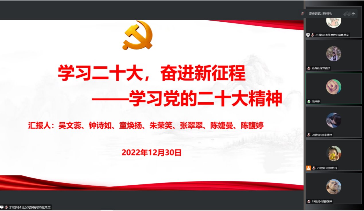 为深入学习党的二十大精神,深刻体会中国特色社会主义道路优势,学生党支部12月30日下午通过腾讯会议学习分享活动。本次学习分享会的主题为“学习二十大,奋进新征程”。学生党支部书记王婷婷以及学生党支部全体党员参与了本次分享会。